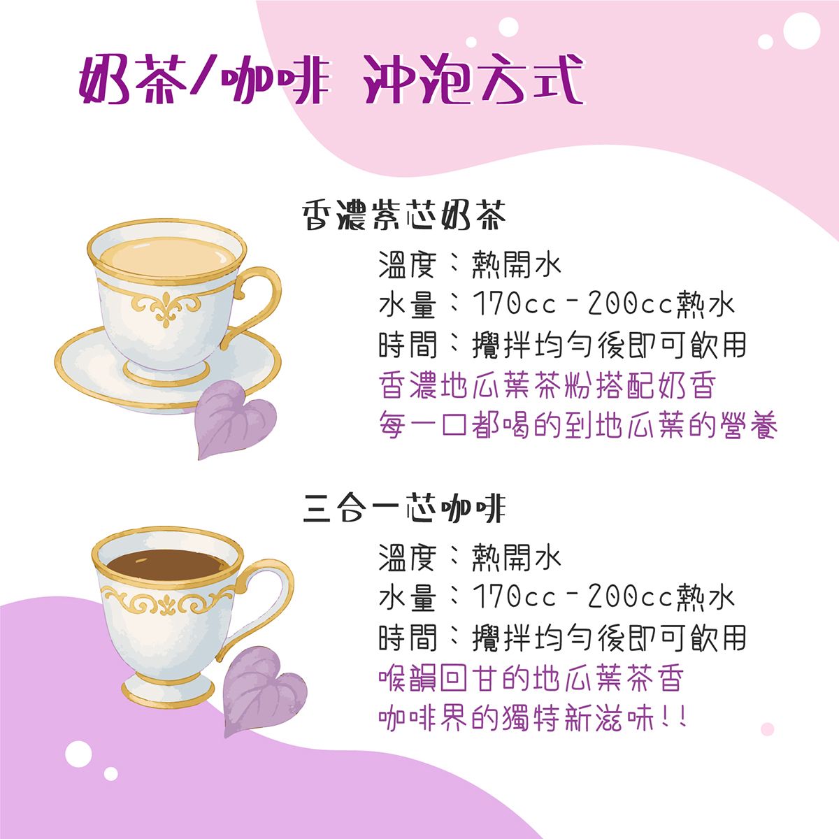 紫地瓜葉茶磨成細緻粉末,與濃郁醇香的三合一咖啡組合,完美融合出雙重滋味,多一層清香,驚艷每一口!